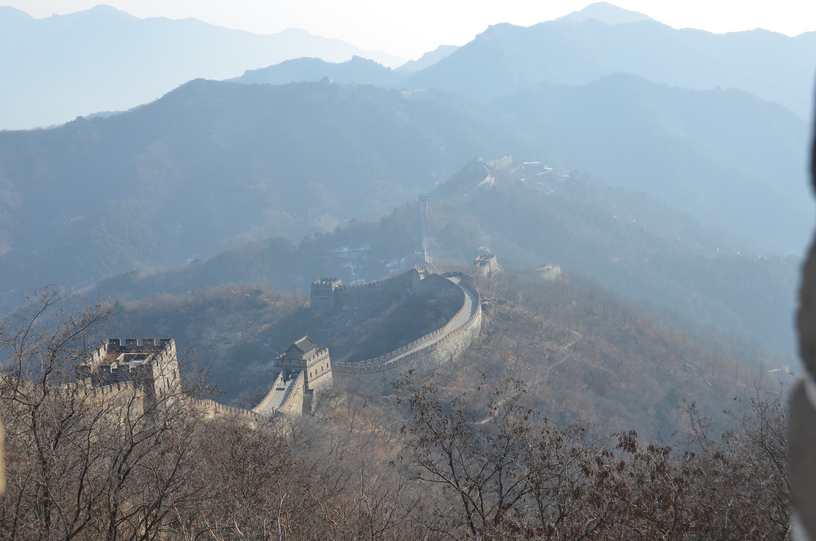 I'm still in awe over my visit to the Great Wall. There really are no words to describe its magnificence and beauty. Pictures don't even begin to show how detailed and massive the Wall really is. Not to mention steep. It was a wintery, cold day when we visited but once we took the cable car up the mountain, it was surprisingly very warm. Walking the Wall is not a leisurely stroll. I got quite a workout climbing endless, narrow and steep steps. I was very thankful that Bill made me buy a new pair of sturdy boots for this trip. It was over an hours drive from Beijing to the Mutianyu section of the Wall. We wound through the countryside and tiny villages where farmers hearded their sheep down tiny roads. So many amazing sights that I will surely never forget.